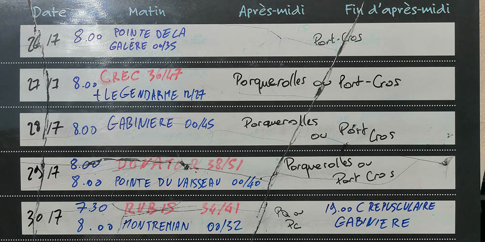 Il existe plusieurs structures pour plonger. J'ai retenu Dune la Londe, ce club possède 2 bateaux (l'Eurêka et l'Apogon) qui permettent de séparer les débutants et les apprentis des confirmés, les destinations étant bien différentes. Enfin, l'Eurêka est très rapide et évite de perdre du temps lors des transfert vers les spots.